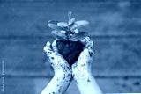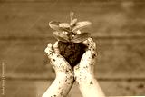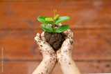 Children`s hands holding young plant with wooden floor background. Ecology concept