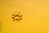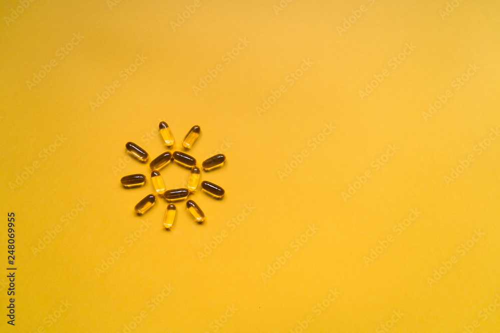 Capsules of fish fat oil in the sun shape, omega 3, vitamin e on the yellow background. Healthy food diet. Nutritional supplement