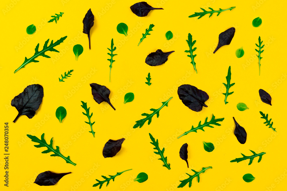 Pattern with salad leaves. Red beet Morello, arugula isolated on yellow background. Vegetable mix Flat lay. Healthy vegetarian food. Top view