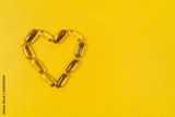 Close up capsules of fish fat oil in the heart shape, omega 3, vitamin e on the yellow background. Healthy food diet. Nutritional supplement