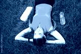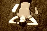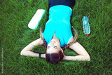 From above shot of young fit sportswoman lying on green grass and listening to music with headphones smiling happy