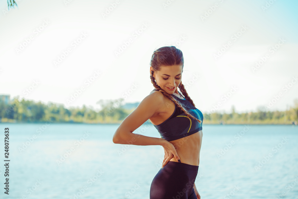 Side view of happy young fit sportswoman standing on seafront looking down at her buttocks, fit body, slim figure.