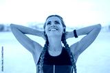 Bright happy sportive woman in sportswear standing on city seafront looking up enjoying weather and life