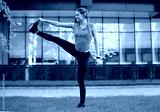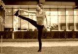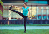 Pretty young brunette in sportswear stretching legs on green meadow standing in splits and smiling away on urban background