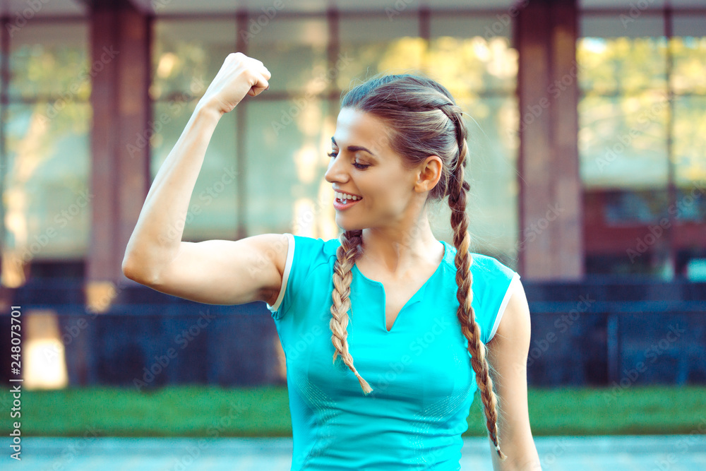 Charming fit sportswoman showing bicep looking at it with smile on urban background