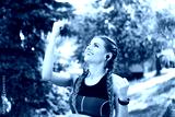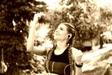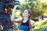 Sporty girl cheering, winner. Woman at sports cheerful with arms stretched pumping fists smiling screaming of joy outside in a green park on background. Beautiful sporty mixed ethnicity woman outdoor.