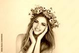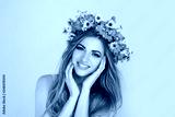 Young beautiful woman with floral crown on head looking at camera smiling hands around face posing on light green blue studio background with copy space. Multicultural model with headband from flowers