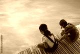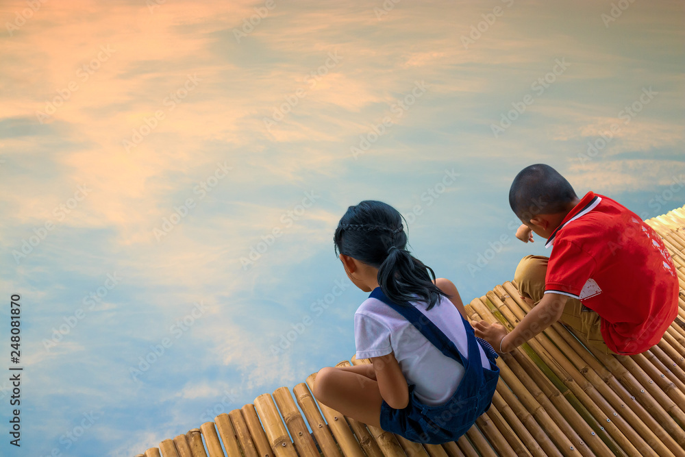 Boy and girl on bamboo bridge and sky ,discovery and adventure concept.