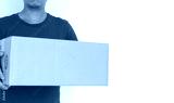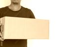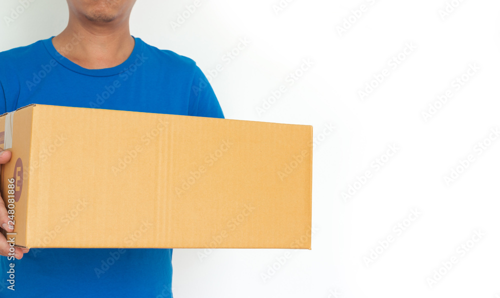 Closeup hands of delivery man holding package to deliver. Courier hand holding brown box isolated on white background.