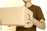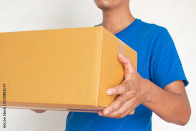 Closeup hands of delivery man holding package to deliver. Courier hand holding brown box isolated on white background.