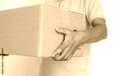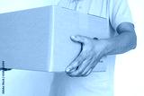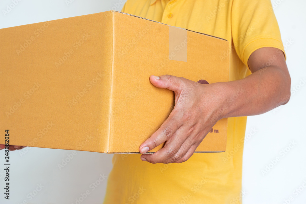 Closeup hands of delivery man holding package to deliver. Courier hand holding brown box isolated on white background.