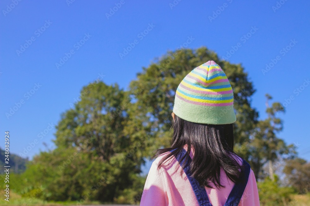 Little child girl on the background of the forest trees on blue sky. Girl discovery freedom adventure concept.