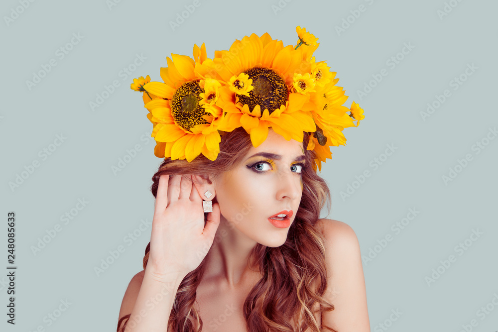 Woman with floral headband hand to ear listening in shock. Closeup portrait of Noisy Caucasian Fashion girl with crown from sunflowers on head hand to ear isolated on gray background with copy space.