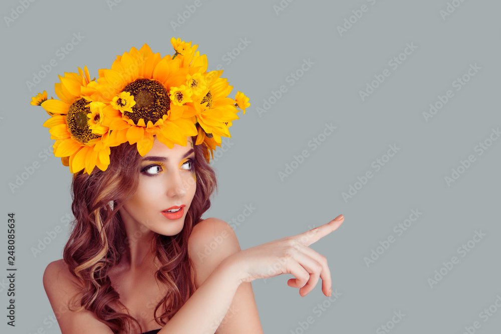 Beauty smiling brunette woman with floral headband pointing away up aside to copy space and looking to side. Fashion girl with crown from sunflowers on head isolated on gray background with copyspace.