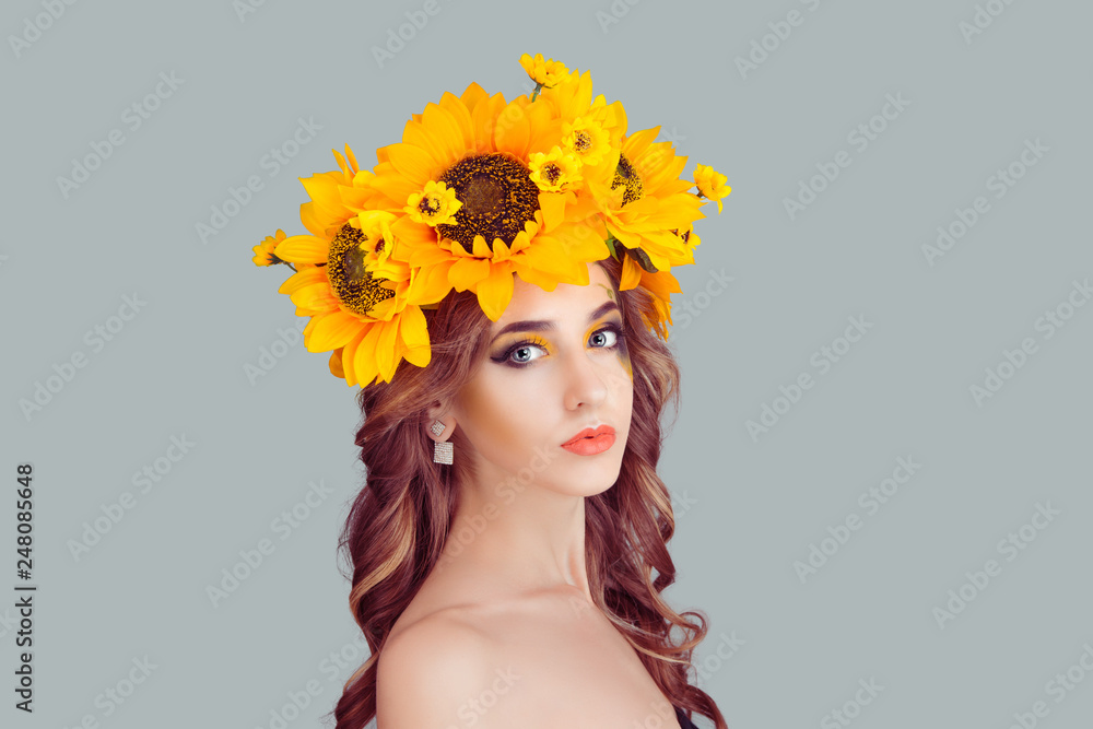 Beautiful young woman beauty and fashion portrait with wreath headband of sunflower yellow flowers painting on face looking at you isolated on light grey background wall in studio horizontal shot.
