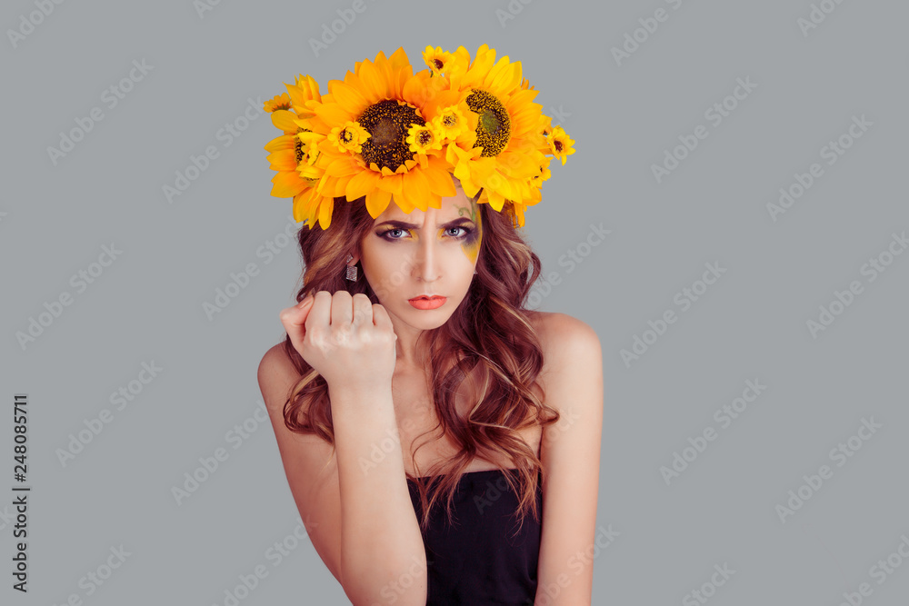 Emotional displeased young Woman with floral headband showing fist in anger isolated over gray background. Fashion girl with crown from sunflowers on head.