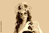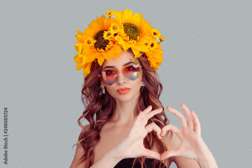 Woman in sunflowers floral headband wearing heart shaped sunglasses over isolated gray background smiling puckering lips in love showing heart symbol and shape with hands. Romantic Valentine concept.