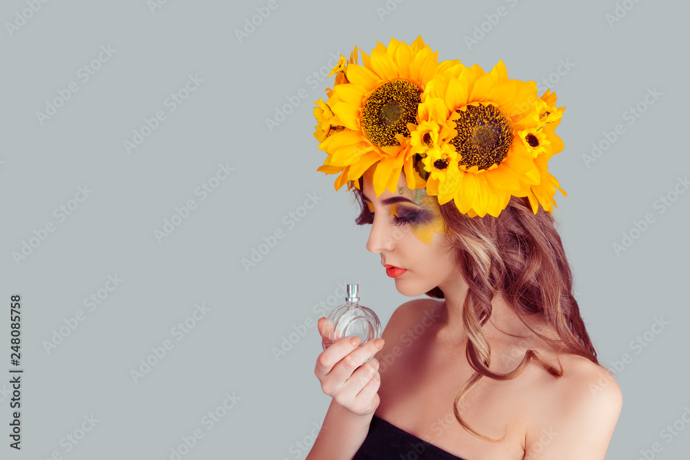 Beautiful sensual Woman with floral headband holding perfume bottle smelling aroma. Fashion girl with crown from sunflowers on head isolated on gray background with copy space. Excellent odor smell.