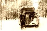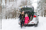 Happy mother with the little daughter and Christmas tree sitting in the car in the winter forest