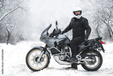 Rider man on adventure motorcycle. Winter fun. snowy day. the snow under the wheels of a motorbike. Enduro. off road dual sport travel tour, active life style concept. winter clothes, equipment