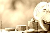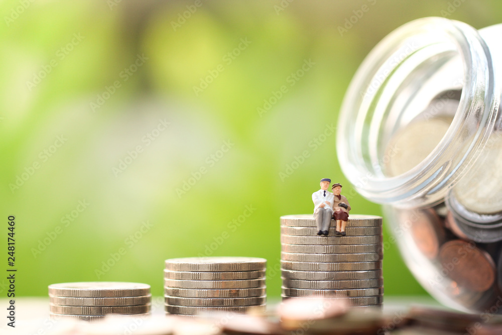 Miniature people: Elderly couple sitting on stack of coins with piggy bank on green bokeh background with copy space. Business, money saving, investment, and retirement planing concept