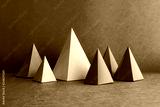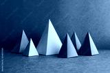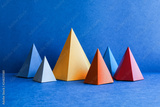 Minimal geometric still life background. Platonic solid geometric figures. Three-dimensional pyramid rectangular triangle objects on blue background. Yellow blue red green colored tetrahedron abstract