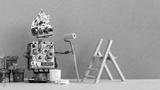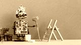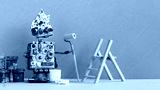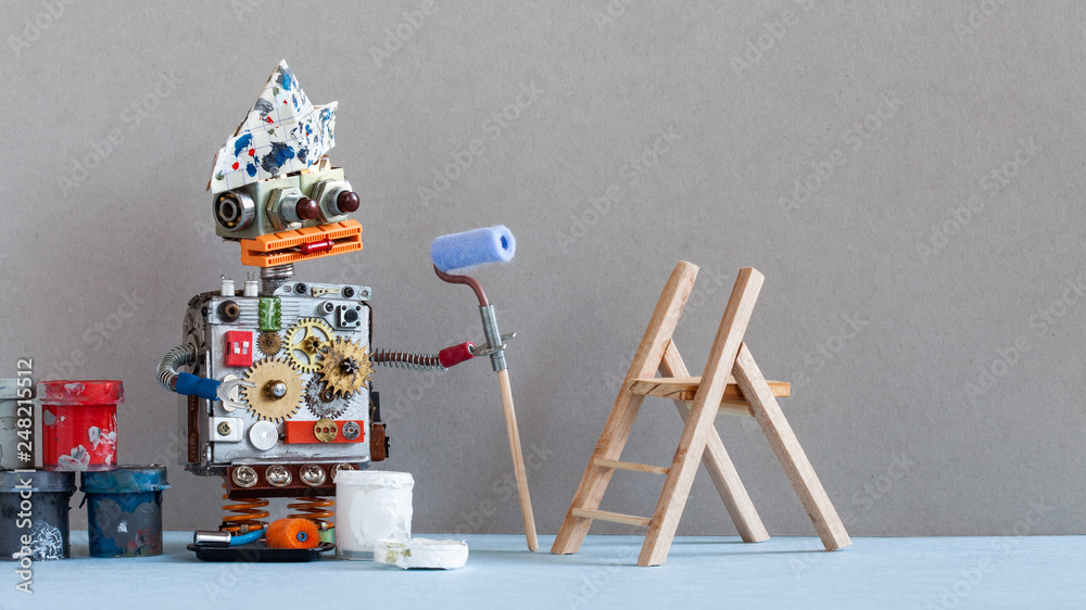 Robot decorator with paint roller, wooden ladder. Robotic painter ready for interior improvement. Gray wall blue floor room