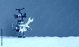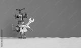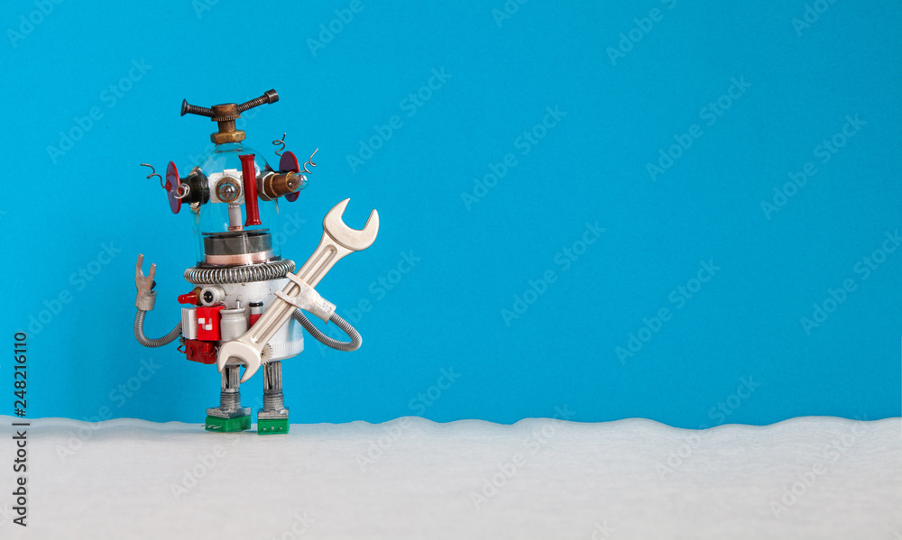 Maintenance service concept. Funny electrician robot handyman ready for repair housework. Robotic toy character with hand wrench, blue gray background. empty space for design