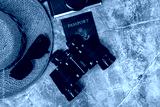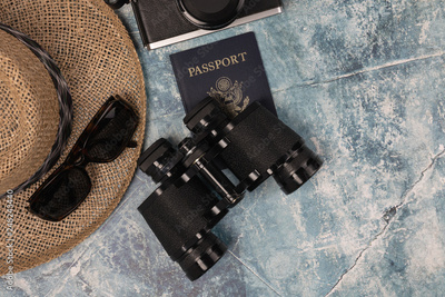 men's travel concept with one passport, sunglasses, masculine straw hat and camera on a mottled teal background