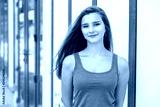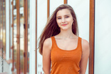 Woman happy with colorful orange shirt, city store on background