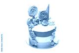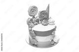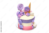 birthday cake with colored stripes of pink and purple decorated with multicolored marshmallows on an isolated white background