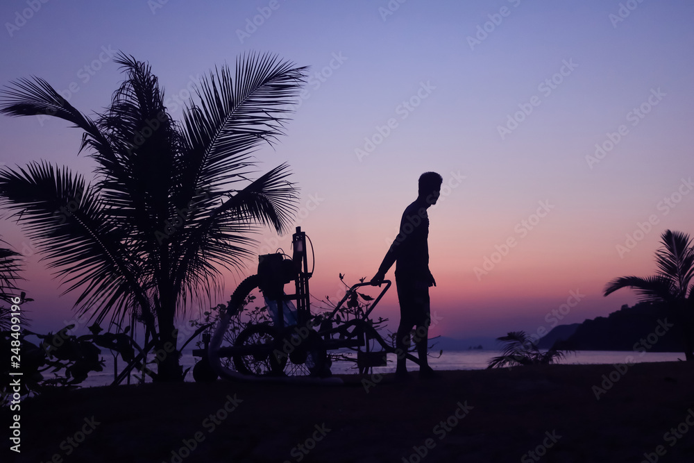 Beach cleaning machines with asian worker clean a little of waste and piece of foam on the beach