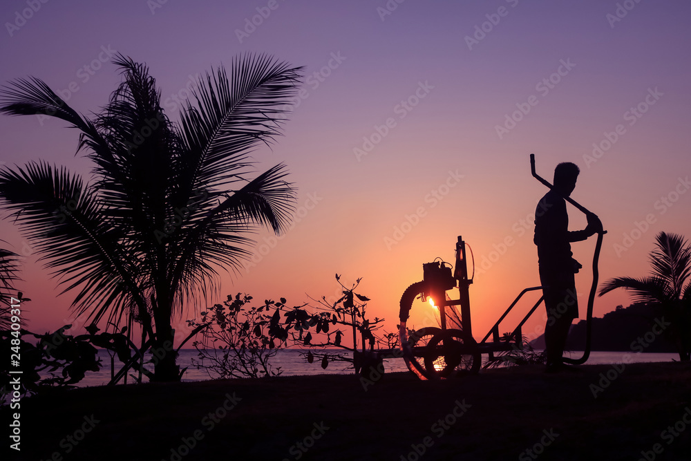 Beach cleaning machines with asian worker at sunrise sky early morning.