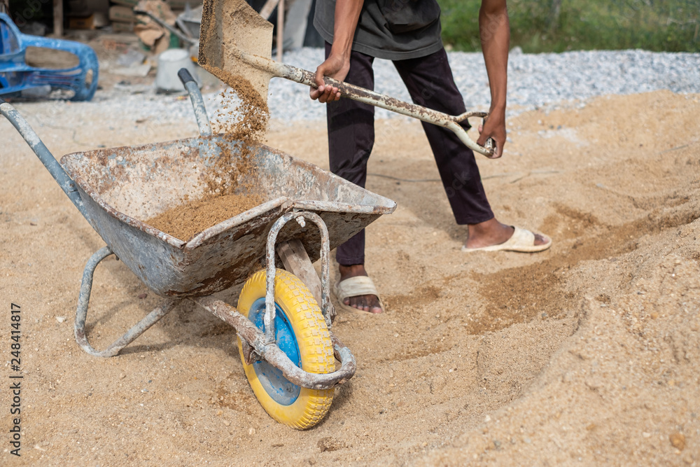 A worker use the shovel to fill the sand into the wheelborrow for construction of new house. Construction tools
