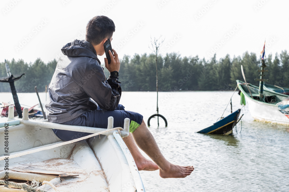 Young asian man sit on prow of finish boat at evening time. He is taking on mobile phone. Travel and relaxation concept.