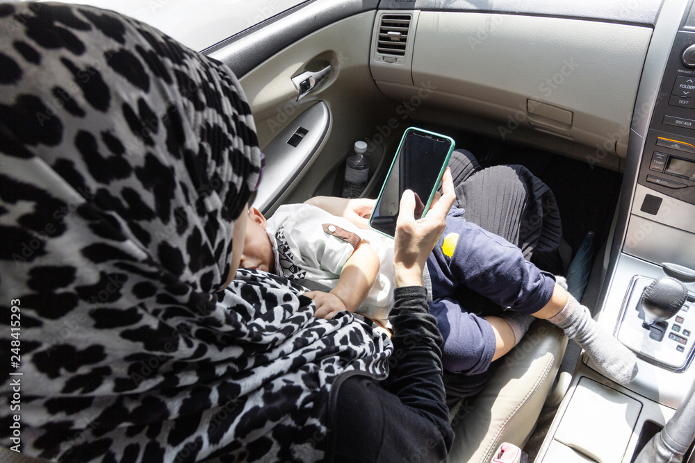 Mother breastfeeding child in a car, public breastfeeding concept.