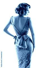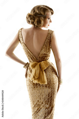 Retro Fashion Model Gold Dress, Woman Old Fashioned Beauty, Back View over White Background