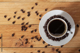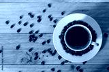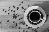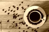 White cup of coffee with beans on table, top view.