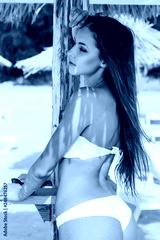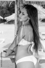 Beautiful happy woman in bikini relaxes resting on the beach in summer.