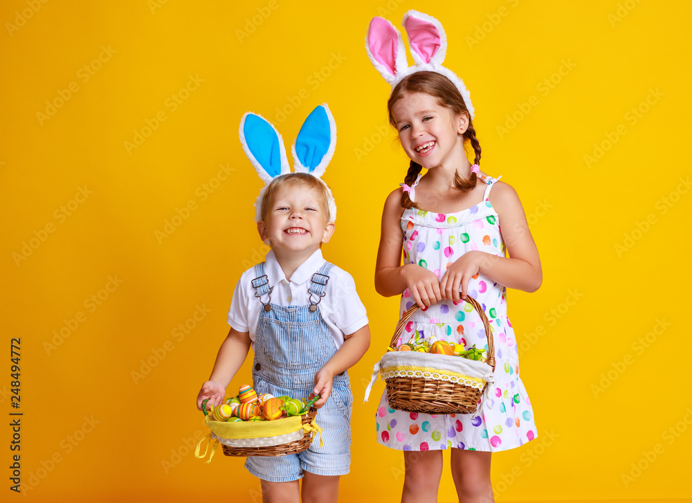 funny happy child boy with easter eggs and bunny ears on yellow