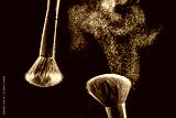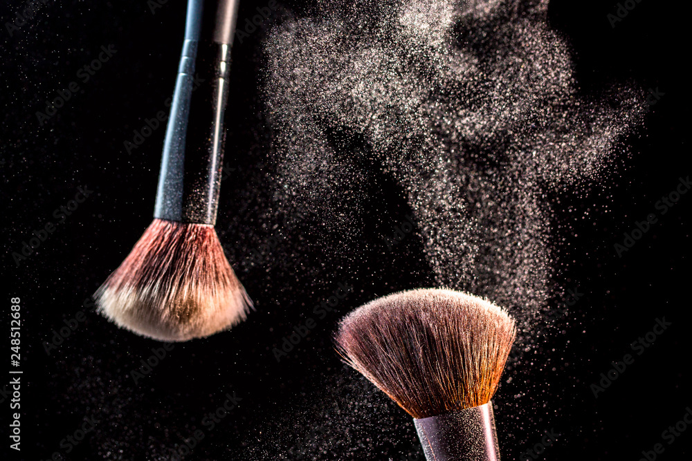 Make up cosmetic brushes with powder blush explosion on black background. Skin care or fashion concept.