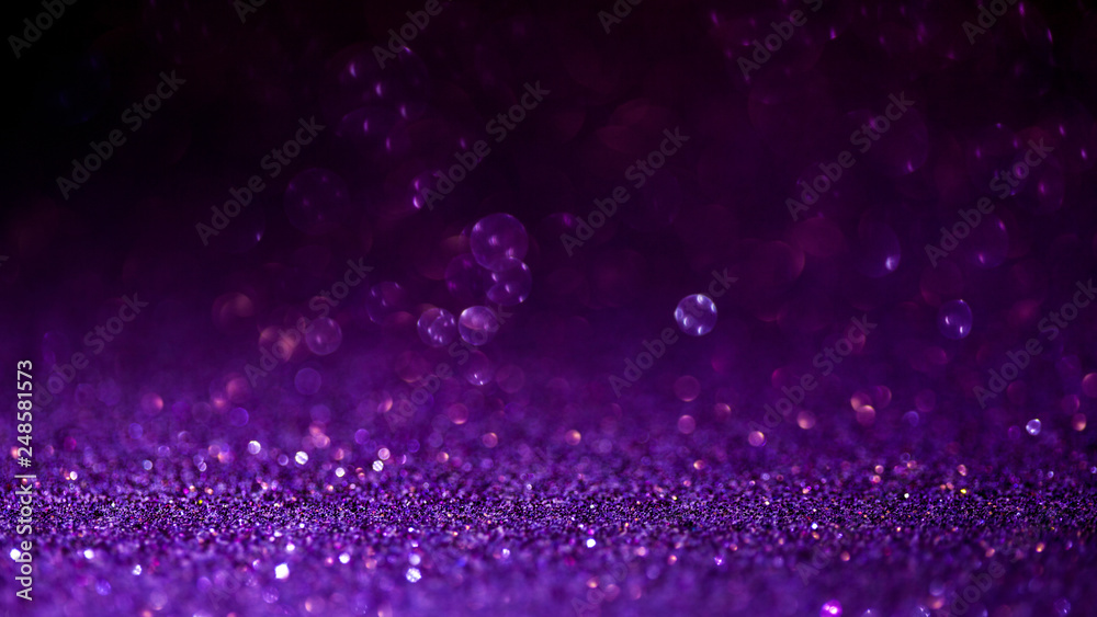 Purple glitter magic background. Defocused light and free focused place for your design.