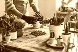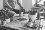 Woman gardeners hand transplanting cacti and succulents in cement pots on the wooden table. Concept of home garden.