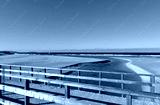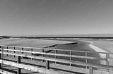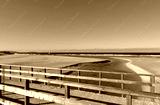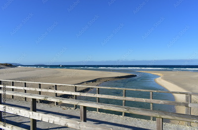 Beach with river, wooden handrail and seagulls. Golden sand and sea with waves and white foam. Blue sky, sunny day. Galicia, Coruña Province, Spain.