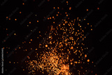 Burning sparks flying. Beautiful flames. Fiery orange glowing flying away particles on black background.
