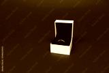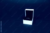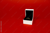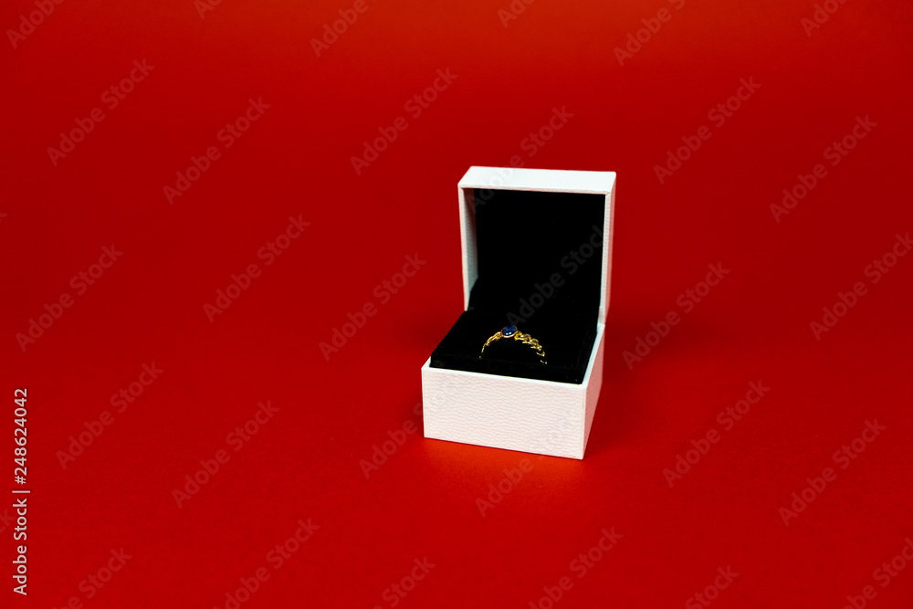Beautiful golden ring with blue gemstone in the white box isolated on red background. Valentines Day.