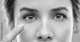 vision, beauty and people concept - close up of woman pointin finger to eye