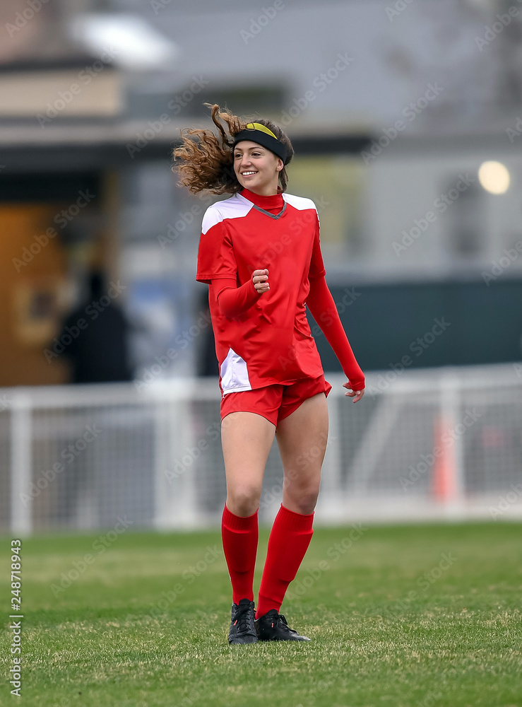 Young high school girl competing in a soccer match