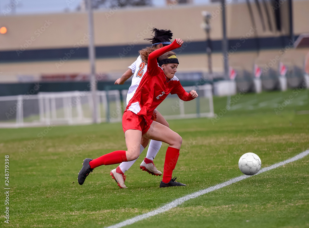 Young high school girl competing in a soccer match