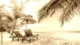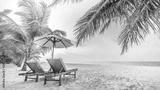 Tropical beach resort hotel background as summer landscape with lounge chairs and palm trees in sun rays and calm sea for beach banner. Luxury vacation and holiday destination concept